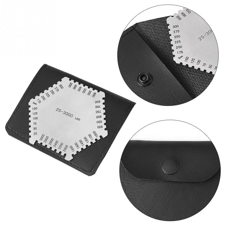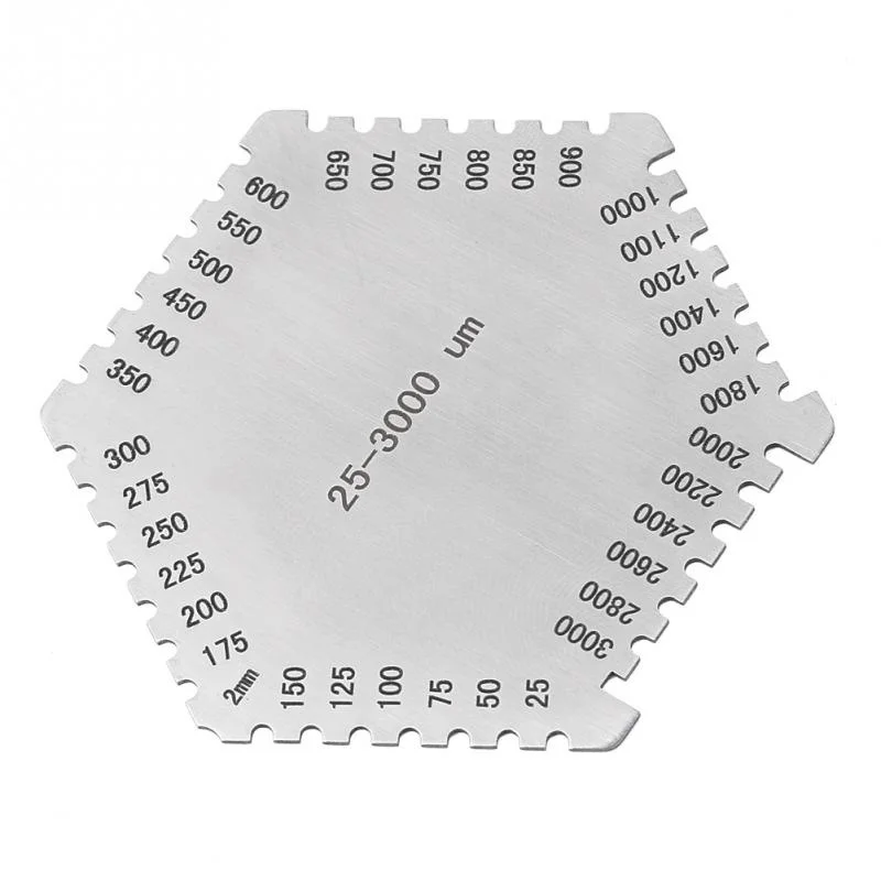 - Comb gauge measuring range in detail: 25, 50, 75, 100, 125, 150, 175, 200, 225, 275, 300, 350, 400, 450, 500, 550, 600, 650, 700, 750, 800, 850, 900, 1000, 1100, 1200, 1400, 1600, 1800, 2000, 2200, 2400, 2600, 2800, 3000um